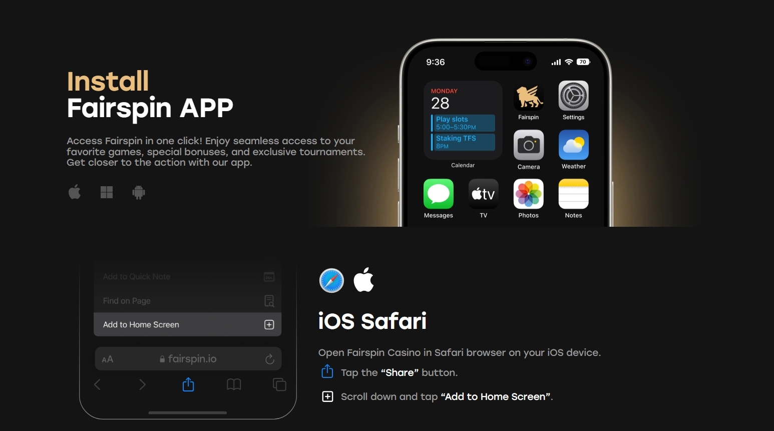 - TFS Token Rewards: The benefits of the Fairspin Token ecosystem, including Play to Earn (earning TFS by betting) and Hold to Earn (staking TFS for rewards), are fully accessible through the mobile version.